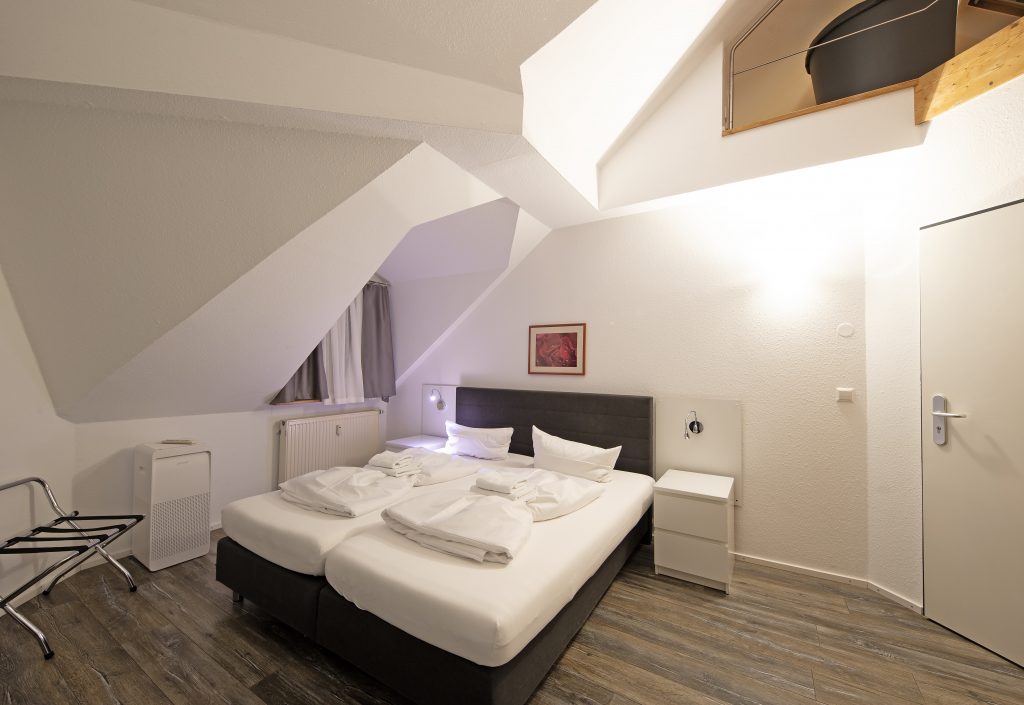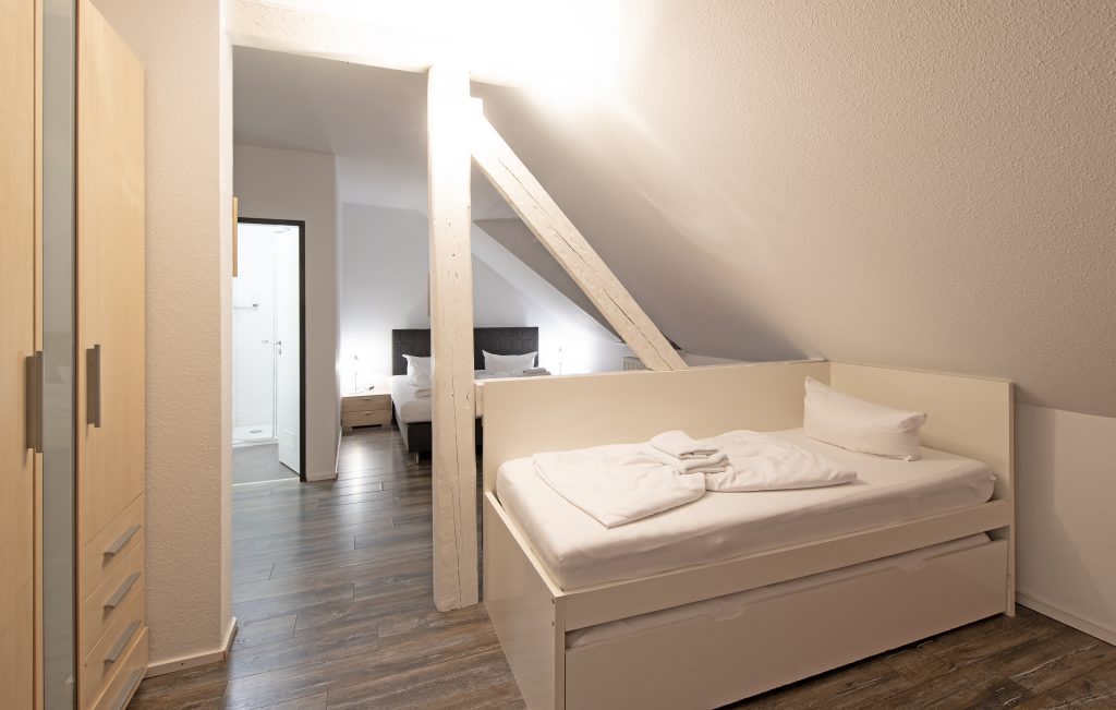 Wir verfügen über drei individuell gestaltete Familienzimmer, die sich in Aufteilung und Ausstattung unterscheiden. Zweistöckiges Familienzimmer Eines der Familienzimmer erstreckt sich über zwei Etagen und eignet sich ideal für 3 Erwachsene oder 2 Erwachsene und 2 Kinder. Die obere Ebene ist über eine Treppe erreichbar. Beide Etagen teilen sich ein gemeinsames Bad mit Dusche und WC.